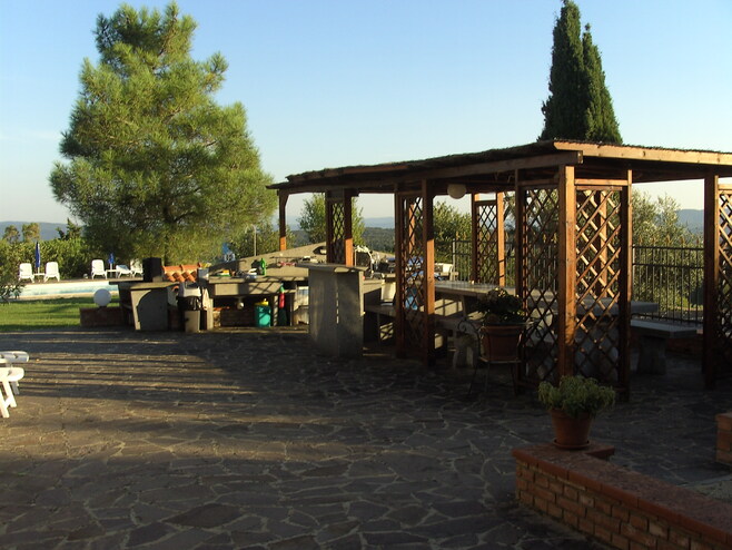 Auf dem großen Grundstück gibt es viele Möglichkeiten Entspannung und Erholung zu finden. In absoluter Ruhe, ohne Straßenlärm kann man die Seele baumeln lassen. Am Tag blickt man über das weite Land und die Hügelketten der Toscana, in der Nacht kann man Sternschnuppen zählen, den Nachtigallen und Fröschen beim Konzert lauschen. Eine großzügige Außenanlage kann von allen Mieteinheiten gemeinschaftlich genutzt werden. Der große Pool 13,5x6m und 1,90m tief, nur für Schwimmer (von Mai bis Oktober, je nach Wetterlage) bringt Erfrischung, auf der Liegewiese kann man lesen, sonnenbaden oder relaxen. Unser Haus verfügt über 4 verschieden große Wohnungen. Alle haben einen eigenen Eingang und eine eigene Terrasse. Ein Parkplatz ist vorhanden. Die große Außenküche mit einem Gas-Grill und einem Holzkohlegrill, ausgestattet mit Gläsern und Geschirr, steht jedem Gast zur Verfügung. Oder auch für Geburtstage sowie gemeinsame Abende mit anderen Gästen.